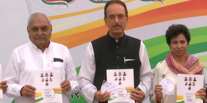 - कांग्रेस ने हरियाणा चुनाव के लिए अपना मेनिफेस्टो जारी कर दिया है. कांग्रेस के वरिष्ठ नेता गुलाम नबी आजाद, पूर्व मुख्यमंत्री भूपेंद्र सिंह हुड्डा और प्रदेश अध्यक्ष शैलजा कुमारी ने संकल्प पत्र जारी किया.