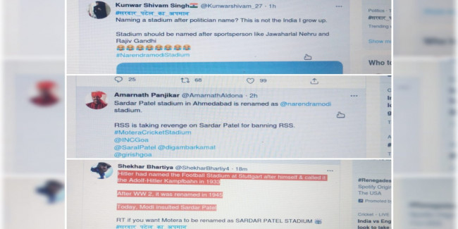 By running the hashtag, "#SardarPatelKaApman", a user wrote, "Hitler had named the Football Stadium at Stuttgart after himself & called it the Adolf-Hitler Kampfbahn in 1933. Modi insulted Sardar Patel."