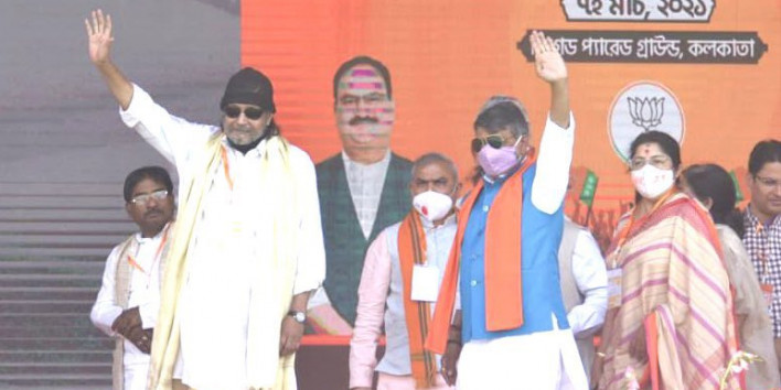- Mithun Chakraborty was inducted into the BJP before the PM's arrival. He joined BJP in the presence of state BJP president Dilip Ghosh, party in-charge of the state Kailash Vijayvargiya.