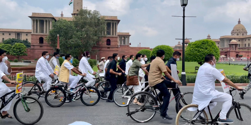 - कांग्रेस नेता राहुल गांधी और कई अन्य विपक्षी ईंधन और खाद्य वस्तुओं की कीमतों में बढ़ोतरी के विरोध में मंगलवार को साइकिल से संसद पहुंचे।
