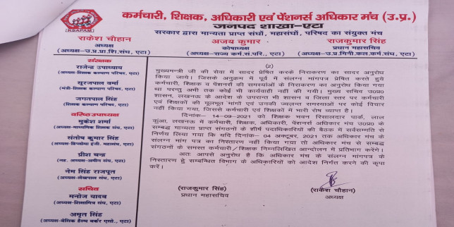 - उत्तर प्रदेश के जिला एटा में कर्मचारियों, अधिकारियों, पेंशनरों की समस्याओं के निराकरण के लिए कलेक्ट्रेट स्थित धरना स्थल पर अधिकार मंच द्वारा एक दिवसीय धरना प्रदर्शन आयोजित किया गया।