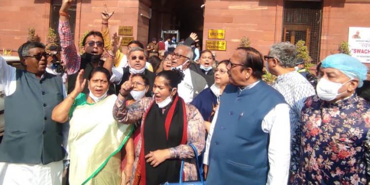 - Due to this, the TMC MP's sat on a dharna outside North Block and raised slogans.