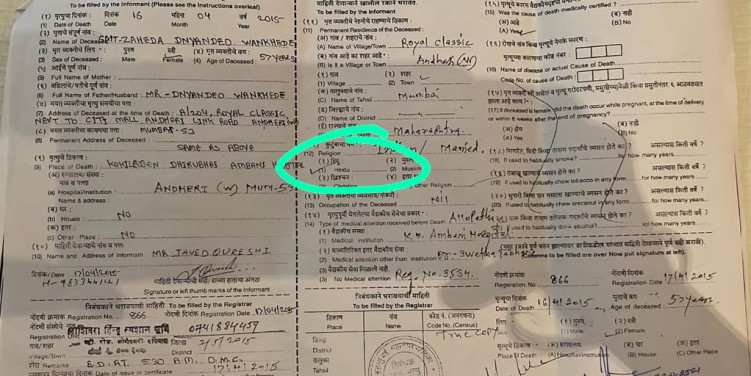 - Malik alleged that in the death certificate he has written Hindu and in the last rites religion has been written as Muslim.