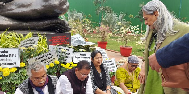 - निलंबित विपक्षी दलों के ये सभी 12 सांसद इस मुद्दे को लेकर संसद परिसर में गांधी प्रतिमा के सामने धरना-प्रदर्शन पर बैठे हुए है।