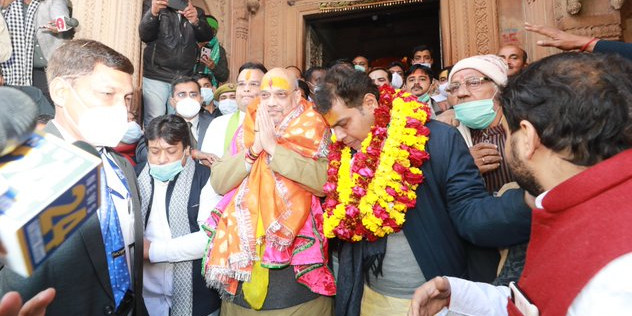 - 'वृंदावन पहुंचकर सबसे पहले बांके बिहारी मंदिर में पूजा-अर्चना की गई और आगे अमित शाह ने ब्रज क्षेत्र की समस्त जनता को हाथ जोड़कर धन्यवाद किया।'